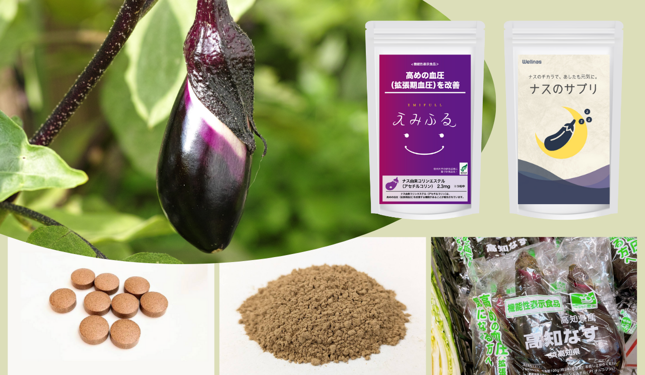 ナスはスーパーベジタブルです!ナスに豊富に含まれるコリンエステルという成分には自律神経バランスを整えて、血圧低下、気分改善、睡眠改善など様々な機能性があることがヒト臨床試験で明らかとなりました。このエビデンスに基づき、ウェルナスでは世界初のナスサプリを開発・販売し、高い評価とリピート率を獲得、メディアでも高い注目を集めています。今後も、ナスを活用した新規ナス機能性食品の開発を進めていきます。