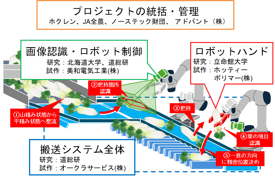 農林水産物把持エンドエフェクタ研究開発プラットフォームとして「露地野菜の安定供給を支える選別出荷施設省人化のための重量野菜自動整列システムの研究開発」を提案し、「スマート農業技術の開発・供給に関する事業」に採択された。本事業では、ダイコンの選別出荷施設の省人化に向けて、画像認識・ロボット制御技術、ロボットハンド技術、搬送システム技術に関する研究開発を進め、システムインテグレーターとの連携を基にして、それぞれの技術を統合する。