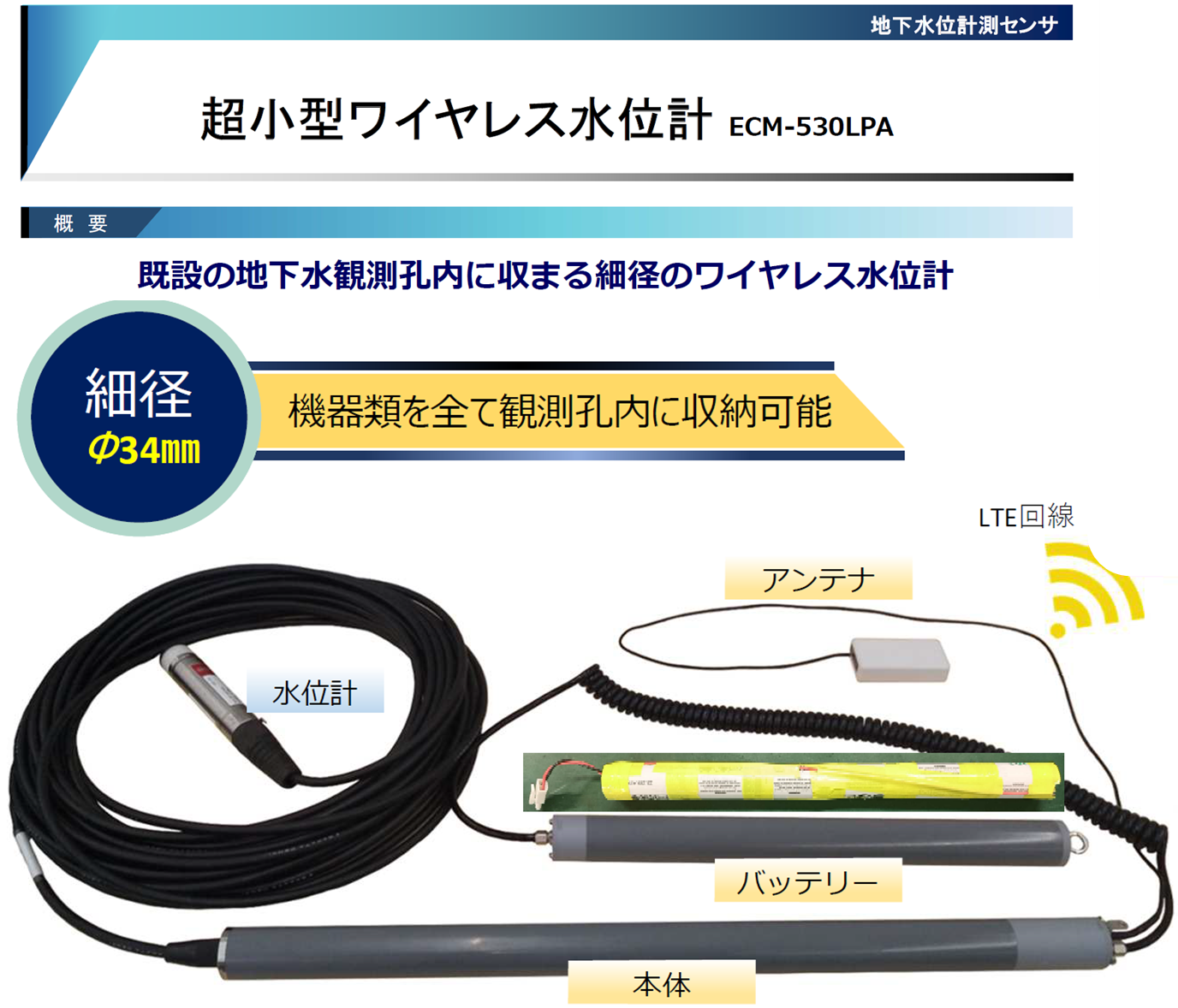 超小型ワイヤレス水位計を開発し、狭小な地下水観測孔に地表に突起なく設置したままでの遠隔リアルタイム地下水位観測を可能としました。